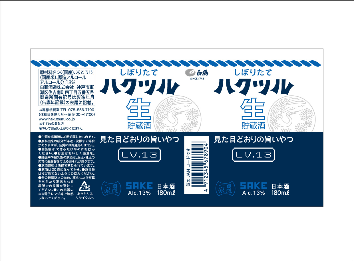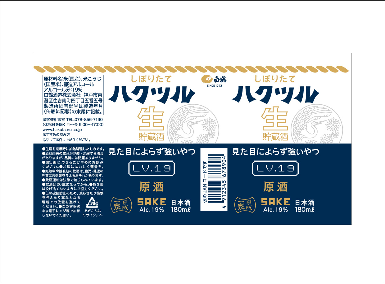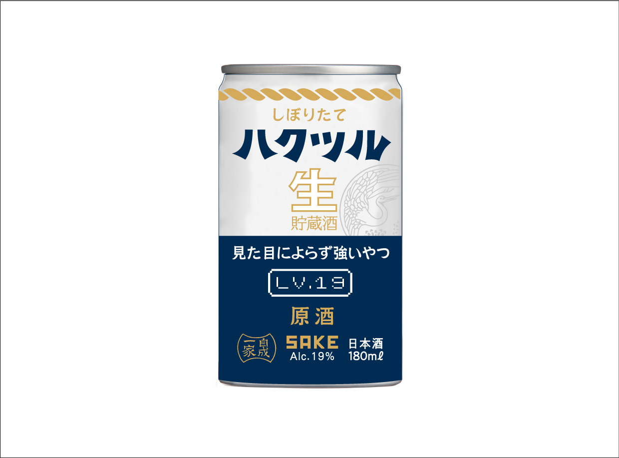 かつて看板ロゴとして使用していた「ハクツル」のレトロなロゴマークを新シリーズは横書きに配置して、酒屋さんの前掛けをイメージしたデザインとカラーを取り入れた缶カップで表現しています。